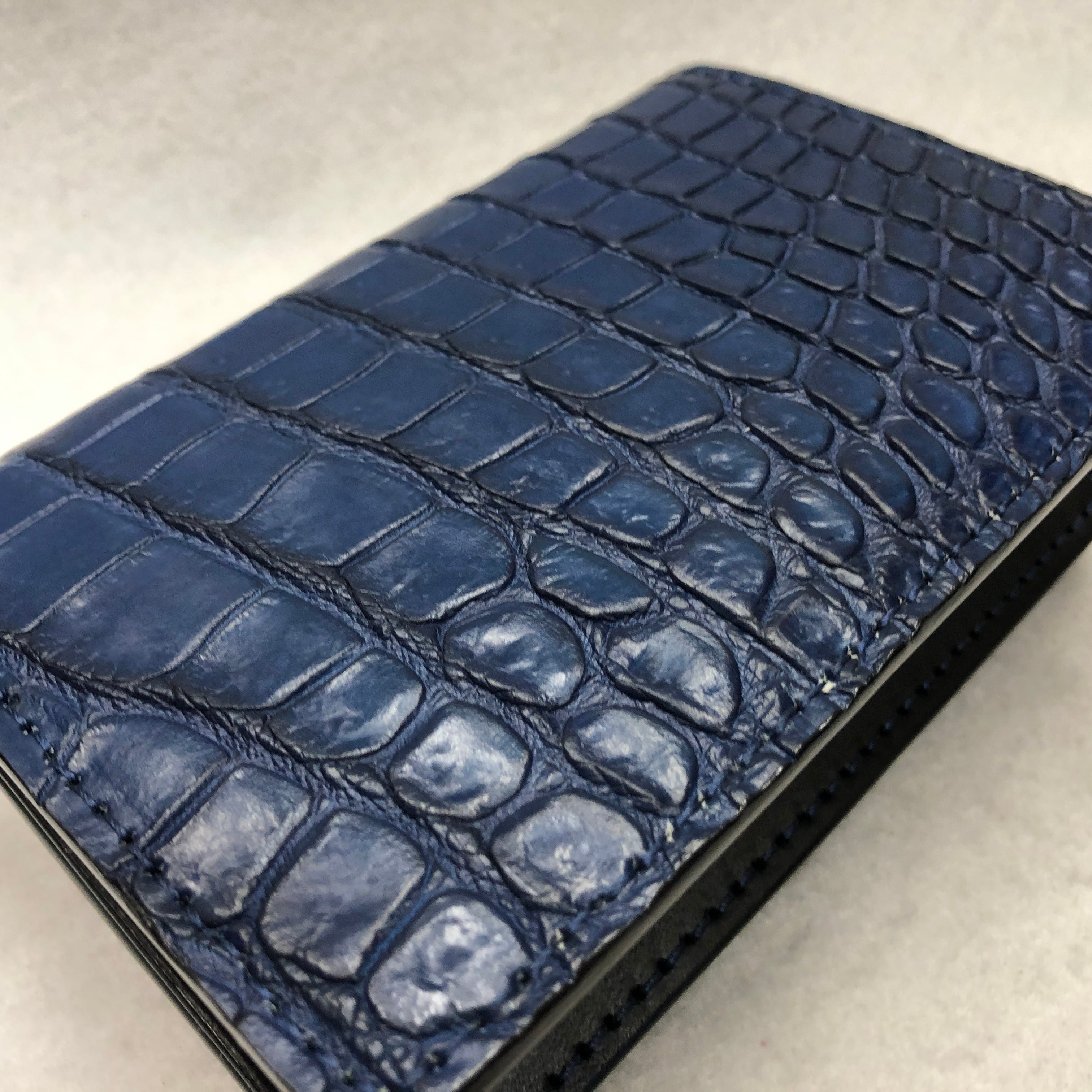 90 藍染めスモールクロコダイル折財布 肚クロコ1顎下 ブラックベース